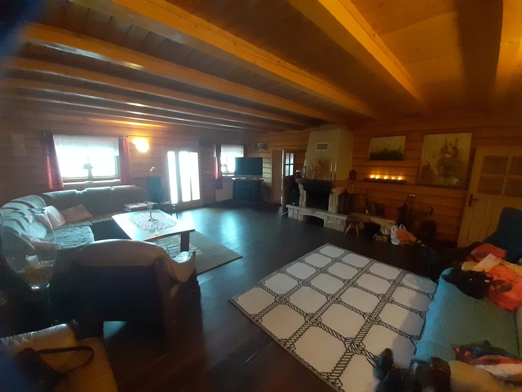 Salon w stylu góralskim z kominkiem, narożnik oraz stół. Do dyspozycji telewizor oraz sprzęt grający.![]()