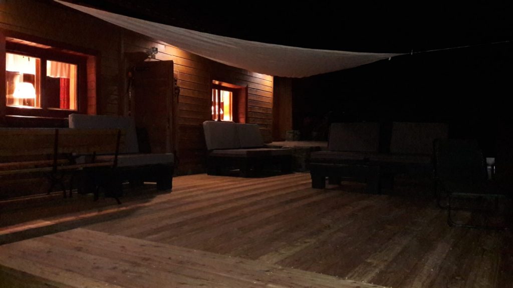 Taras drewniany, z żaglem dla ochrony przed słońcem oraz meblami ogrodowymi do siedzenia dla 10 osób. Ognisko oraz miejsce na grilla, trójnóg. Taras jest podświetlany nocą. ![]()